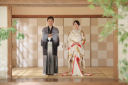 お次は和傘と一緒に。色鮮やかな緑の中に、おふたりの紅白がぱっと映えます。