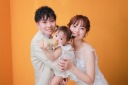 可愛らしい色の壁と椅子を使ったショットです!優しい表情が印象的なおふたりとの撮影でした^^