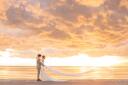 カラードレスからウェディングドレスにお着換え。海辺のフォトウェディングの撮影開始です