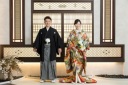 黒紋服×レース風の新和装での全体ショット。おふたりともとても素敵です!