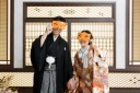 座りとはちがったカッコいい表情で、クールな雰囲気での撮影。赤い色打掛と黒紋服の組み合わせもお似合いです!