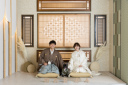 意匠を凝らしたおしゃれな障子を背景におふたりでにっこりと♪