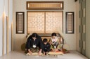 パステルカラーの色打掛とブラウンの紋服のあわせが優しい雰囲気になりますね⚘可愛らしいご新婦様に見つめられてクシャッと笑うご新郎様もとても素敵ですね♪