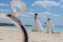 白い砂浜とエメラルドグリーンの海。手を取り合い、のびやかに歩く姿が印象的です。