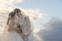 風にふわりと広がるベールの中で見つめ合うおふたり。柔らかな光と透けるベールが、まるで映画のワンシーンのような幻想的な雰囲気を演出しています。