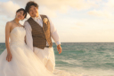 手を繋いで♡とってもキュートな振り返りショット✻ドレスもふんわりと宮古島の海に映えています✧