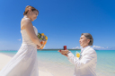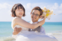 見つめ合うお二人の背景には、どこまでも続く透明度の高い海…⋆