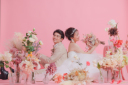 シンプルな印象のお衣裳はどんな背景とも相性バッチリ◎ フラワーウォールで華やかなお写真を♡