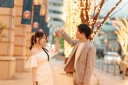 暖簾の下がる飲み屋の前に並び、寄り添うふたり。賑やかな街の音を背に、あたたかな二人の空気感がしっかり伝わるショットになりました!
