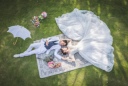 ウェディングドレスの繊細な刺繍を広げ、新郎新婦が寄り添って寝転がる愛おしいシーン♡