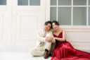 ピンクの壁にブラックドレス・タキシードは甘辛です お茶目なポージングと表情にもご注目