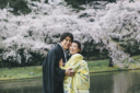 桜の淡い色合いが、新婦様の真っ白な和装を引き立てています。見つめ合う二人の距離感に、春の穏やかな空気が流れています。