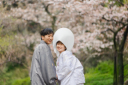 桜の木の下で、手をつないで見つめ合うおふたり。これからの未来へ、ふたりで歩んでいく喜びが溢れています。