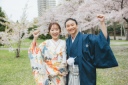 足元の玉砂利が和モダンな雰囲気を演出。お二人の立ち姿が堂々としていて、明るい未来を感じさせる一枚です。