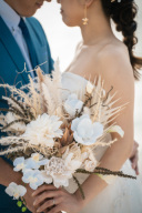 新婦様の笑顔がとてもかわいい1枚!熱帯植物園にあるブーゲンビリアの隙間など沖縄ならではの雰囲気で撮影できます
