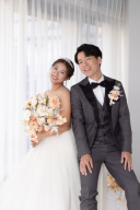新婦が新郎の肩にそっと手を置く自然なポーズお二人の表情が素敵です♡