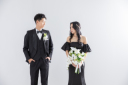 白にカサブランカ柄の刺繍の白無垢と黒紋付きを合わせたクラシックなスタイルです。胡蝶蘭の髪飾りと合わせて、和装のコーディネートも楽しんで。