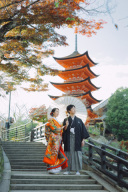 色付いた葉の色と新婦様の白無垢、新郎様の正絹の着物がとても素敵です^ ^