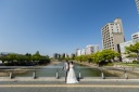 池の上の遊歩道を手をつないで歩くふたり。まるで絵本のようなワンシーン。