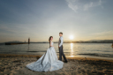 元宇品の海辺で、優しい光に包まれて。ふわふわの真っ白なドレスとベージュのタキシードが海と空に溶け込むように、柔らかい雰囲気を感じさせてくれますね。