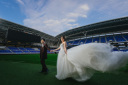 新婦様の煌めくドレスと、新郎様の落ち着いたタキシード、そして鮮やかなブーケが見事に調和し、おふたりの姿を格別なものにしています。
