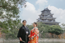 お二人とも和傘を持って撮影!鮮やかな赤の和傘がお二人の姿をより彩ります。