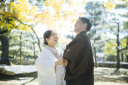 鮮やかな紅葉を背景に、そっと肩を寄せて。お二人の距離感から伝わる安心感と温かさが、見る人の心まで穏やかにしてくれる、優しさに満ちた一枚です。