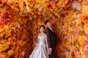 秋の柔らかな光と紅葉がおふたりを祝福。至近距離で見つめ合う、幸福感あふれるカットです。