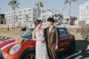 テラコッタのカラードレスとカジュアルなベージュのセットアップのオシャレなコーディネート!背景のフラワーアートがとても映えて素敵でした!!