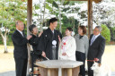 門の前で少し緊張気味。でも、晴れやかなふたりの表情が印象的