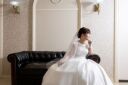 座った新婦さまを、新郎さまが後ろから優しく見つめるシーン。にっこり笑う新婦さまの表情から、ふたりの仲の良さが伝わります。