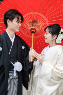 仲良く「寿」の文字を手に持って。アイテムを取り入れることでお祝いの雰囲気が伝わるカットです。和装に映える鮮やかな赤と、おふたりの自然な笑顔が素敵。
