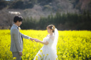 黄色い菜の花の中、和装姿の新郎新婦が春の柔らかな光に包まれました。