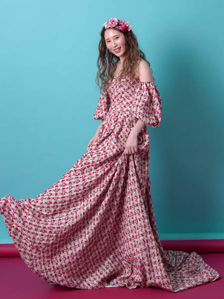 個性あるレッドのMIXツイード生地を使用した一着。後ろはリボンで編み上げており、かわいらしさをプラス。女性らしいカラー、素材感とデザインが、遊び心のあるキュートな花嫁様に見せてくれます。※この衣装は取り寄せです。