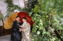 ご新婦様のソロショット。傘からチラッと、どこかを覗いているようなシーンです。真っ赤な和傘で白無垢がさらに美しく見えますね。ご新婦様、和装がとてもお似合いでした!