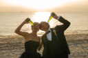 夕日がお二人のスポットライトのようですね!海が夕陽に光を反射してキラキラしています!新婦さんのドレスとリボンが透けてオレンジっぽくなっているのもオシャレ!