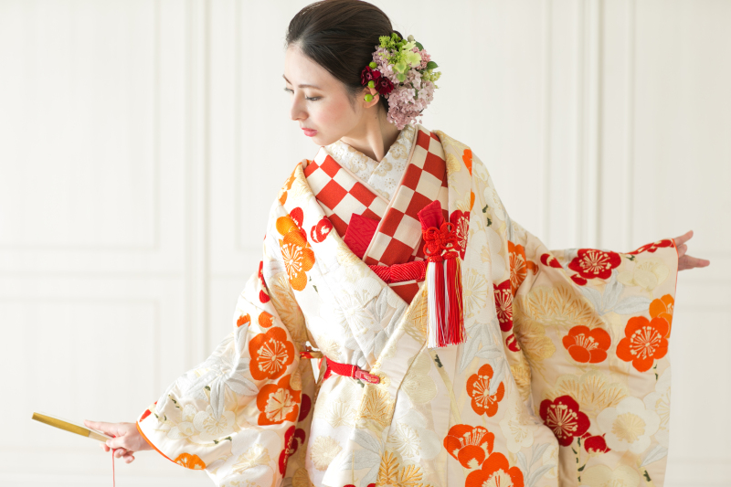 鮮やかな燈に舞う鶴の色打掛。優しい下地に大柄の梅柄の刺繍が全域に施された豪華な打掛。色掛下や和装小物との相性も良く、より個性あふれる花嫁にオススメの1着。