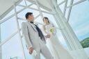 天井が高く、全面ガラス張りの真っ白なチャペル。ロイヤルブルーのタキシードをかっこよく着こなすご新郎様♡