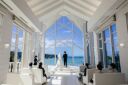 おふたりの後ろ姿。ラグーン大聖堂は白を基調としたオーシャンビューチャペル。おふたりには青い海を見渡しながら、撮影を満喫していただきました♪
