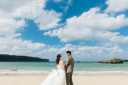 青い海と万座毛を背景にビーチ撮影。おでこを近づけると恥ずかしい感じがしますが、お写真だと自然な距離感なのでロマンティックな雰囲気に仕上がります♡