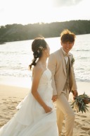 実は、沖縄海岸国定公園の中にあるラグーン大聖堂。仲よく手をつないで、白い砂浜のビーチを満喫できます♪お2人の後ろには沖縄の景勝地”万座毛”が見え沖縄感満載です!