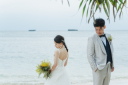 見つめ合うお二人の奥には、青く澄んだ海と空。沖縄で撮ったのが一目で分かる綺麗な青です。撮影中聞こえてくる穏やかな波の音に心が癒されます。