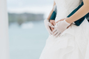春を告げるミモザの花。その明るい黄色のブーケが、お二人の顔を優しく隠します。背景に映る海の青との色の対比も美しいですね♪