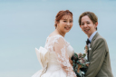 お二人で仲良く入場のシーン♪慣れないエスコートポーズや衣裳にドキドキしながらも、まっすぐと歩みを進めます。海の青さに感動し、思わず表情も明るくなります(^^)