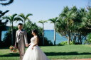 青空の下、南国の木々に囲まれて手をかざすお二人♥沖縄の強い日差しを活かしたユニークな一枚になりました♪