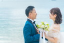 色鮮やかな空と海。そしてトレンドのお洒落なカーキのタキシードと軽やかな女性らしいオフホワイトのドレスがおふたりをより輝かせてくれます(*´▽`*)