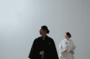 クラシカルな椅子と白い背景。モード感のある一枚です。