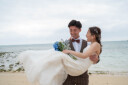 和装からドレスへと装いを変え、舞台は一気に南国のビーチへ。白い砂浜と青い海が、ふたりの新しい表情を映します。