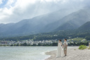 静かな遊歩道側では様々なポージングや動きのあるカットを撮影します★少し照れたお二人もよき★