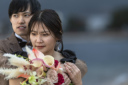 高島田のお鬘が大変お似合いの新婦様。憂いのある表情が素敵。また新郎様のフレームインも臨場感をひきたたせます。